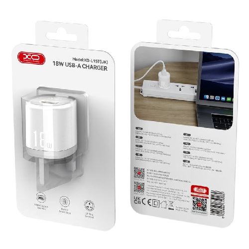 The XO L157(UK) QC3.0 18W Charger is a compact and efficient USB-A wall charger that supports fast charging up to 18W. With wide voltage input (110–240V), it’s ideal for global use. Powered by intelligent chips like FT8493KA and LT6601Q, it supports multiple fast-charging protocols including QC3.0, QC2.0, AFC, FCP, and Apple 2.4A. Made from durable ABS material, available in white color. Suitable for smartphones, tablets, and more. The package does not contain a cable, so you will need to use your mobile’s cable.