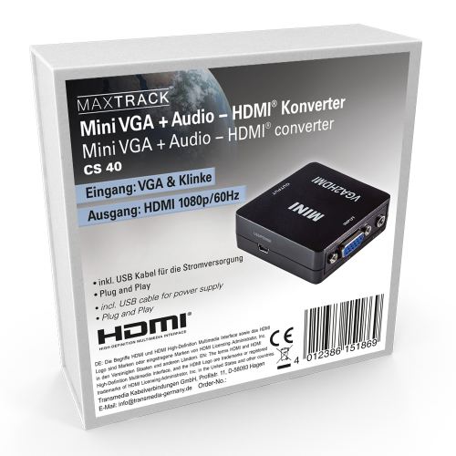 The converter converts the signal into an HDMI® signal. The compact design makes this mini converter extra inconspicuous. This makes it easy to conceal. The installation is plug and play. You don’t need an external driver. Simply plug it in and off you go. Power is supplied via the included USB cable.