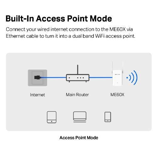 • Built-In Access Point Mode—Connect your wired internet connection to the ME60X via Ethernet cable to turn it into a dual band Wi-Fi access point.