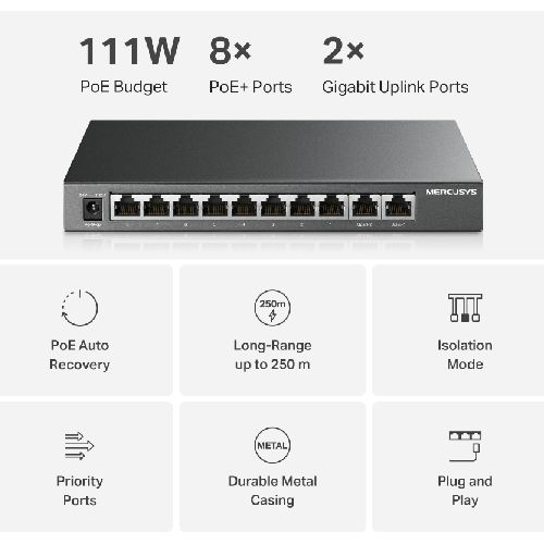 MS110GMP – 10-Port Gigabit Desktop Switch with 8-Port PoE Switch 111W