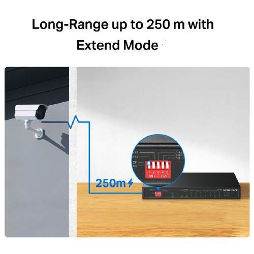 ● Long-Range up to 250 m: Increases PoE transmission distance to 250 m by Extend Mode**